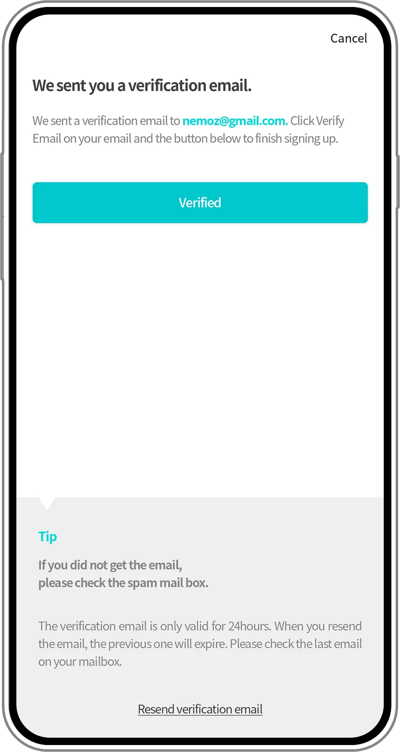 A verification email is sent to the email account you’ve entered. Please press the 'Verify Email' button on your email. When you don't get the email in a minute, please check your spam mailbox.