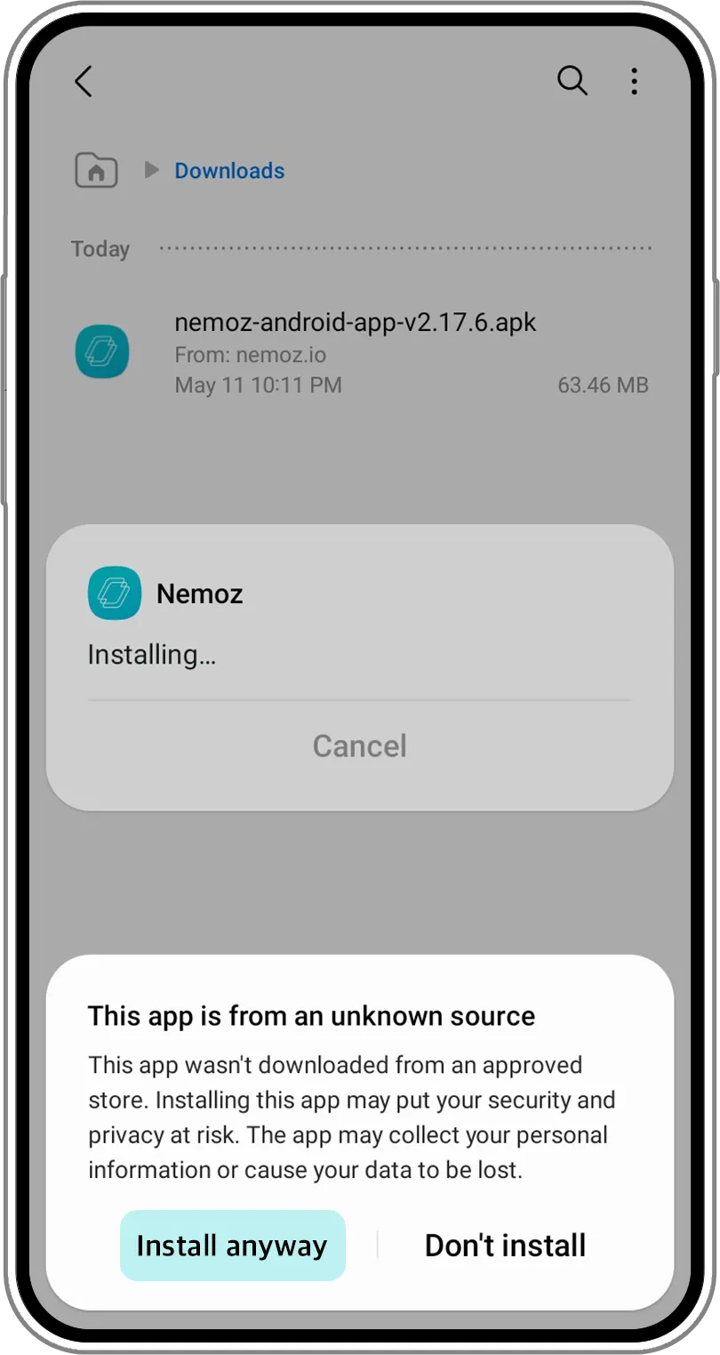 Run the APK you've downloaded. Find nemoz-android-app-v2.17.6.apk from the download folder or run the APK from the alarm bar.
