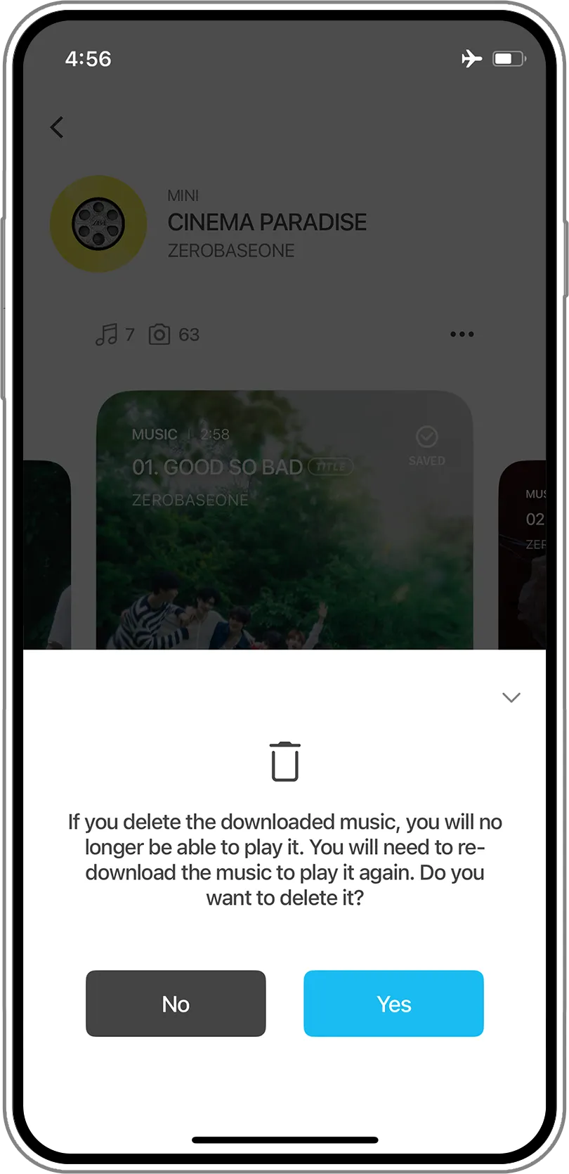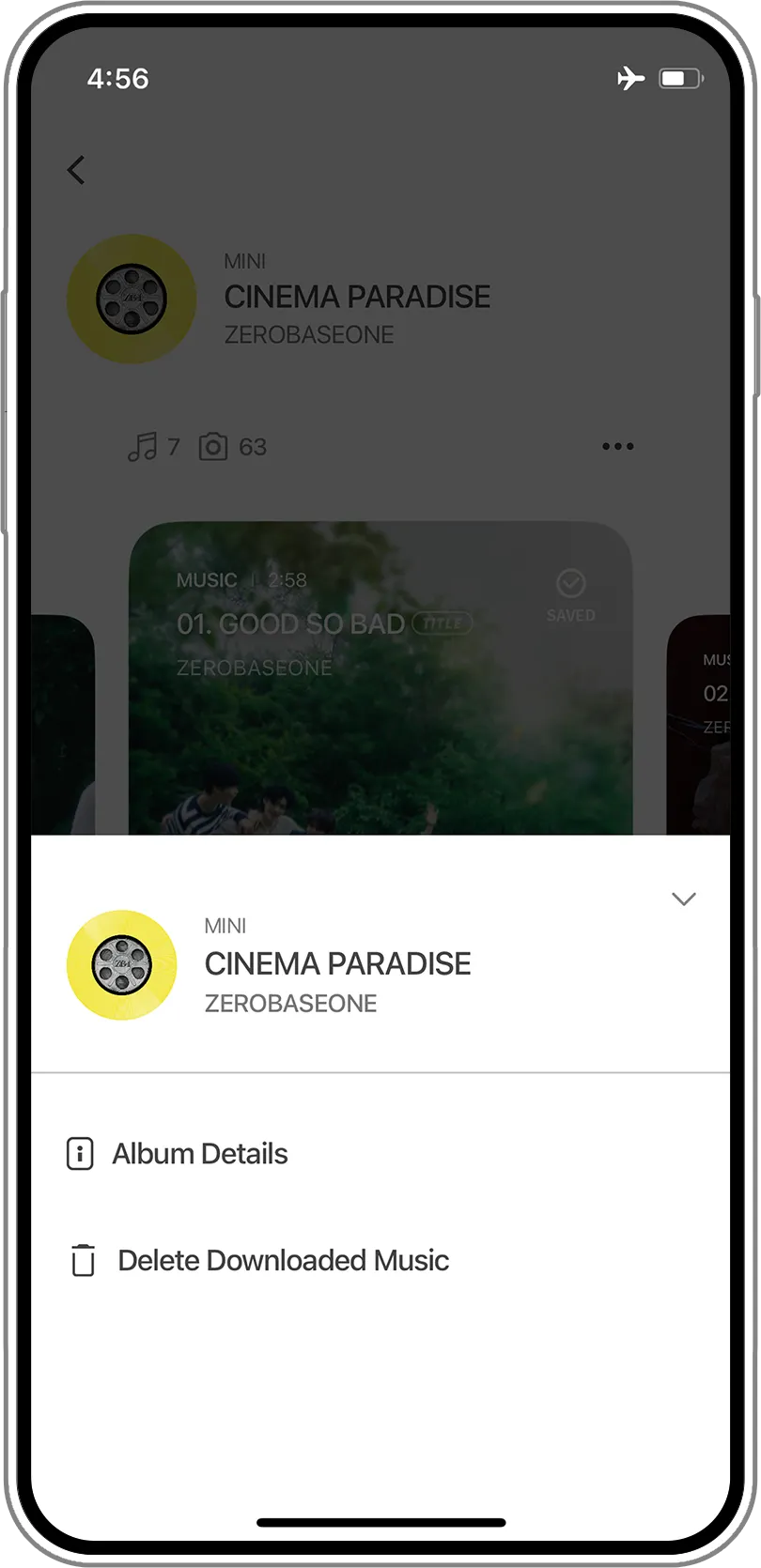 Se o botão "SAVED" não estiver ativado para um álbum já cadastrado, pressione o botão de detalhes do álbum, toque em "Excluir música baixada" e, em seguida, pressione o botão de play para baixar o álbum de novo e utilizá-lo normalmente.